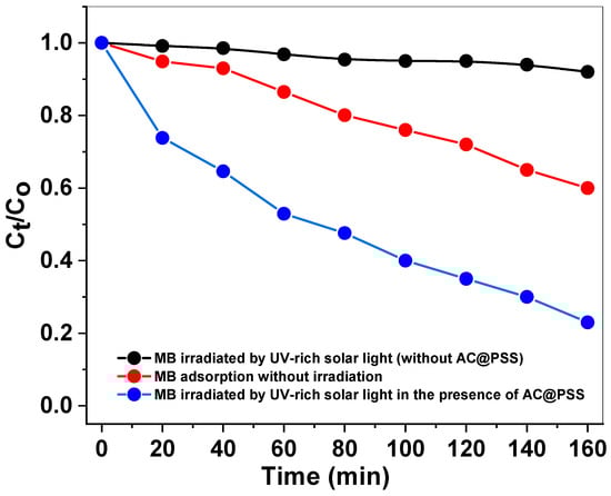 Photocatalytic efficacy (Ct/Co against time) of MB irradiated by UV-rich solar light (without AC@PSS), MB adsorption without irradiation, and MB irradiated by UV-rich solar light in the presence of AC@PSS.