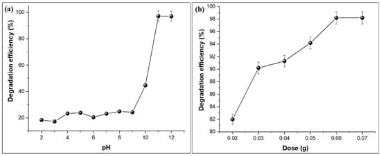 The impact of catalyst dosage on the photo-degradation performance of MB dye was studied at various catalyst dosages from 20 mg to 70 mg using a constant MB dye concentration (10 ppm) at pH: 11 and T: 25 °C, as depicted in Figure 8b. The photo-degradation performance of MB was increased from 82% to 98.20% upon enhancing the catalyst loading from 20 to 60 mg, then it remained constant with further dosage increase to 80 mg. The increases in photo-degradation efficiency of MB with an increase in catalyst dosage are attributed to the availability of a vast number of active centers that enhance the absorption of light, leading to increases in the number of OH radicals developed which can facilitate the photo-degradation of the MB dye [,].