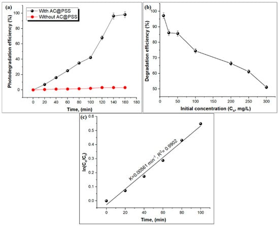 (a) The effect of time on the photo-degradation efficiency of MB dye, (b) the influence of initial MB concentration on photo-degradation efficiency, and (c) photocatalytic degradation kinetics of MB using the AC@PSS composite.