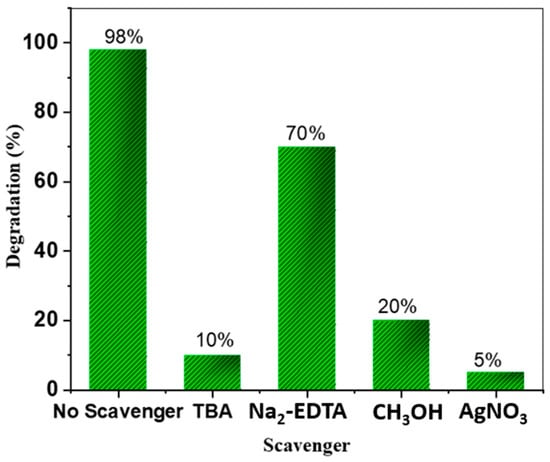 Figure 10 illustrates the effect of different scavengers on the photocatalytic degradation of methylene blue (MB) using the AC@PSS composite. The composite achieved 98% degradation without any scavengers, indicating strong photocatalytic performance under standard conditions. However, the introduction of specific scavengers significantly reduced degradation, highlighting the involvement of various reactive species in the process. Degradation dropped to 10% with tert-butyl alcohol (TBA), a hydroxyl radical (•OH) scavenger, indicating that hydroxyl radicals play a critical role in the photo-degradation mechanism. The use of Na2-EDTA, a hole (h+) scavenger, reduced degradation to 70%, suggesting that photogenerated holes also contribute to the process but to a lesser extent. Methanol (CH3OH), which scavenges superoxide radicals (O2−•), lowered degradation to 20%, demonstrating that these radicals have a secondary but notable role. The most significant reduction occurred with silver nitrate (AgNO3), an electron (e−) scavenger, bringing the degradation down to 5%, underscoring the importance of photogenerated electrons. This suppression occurs because photogenerated electrons play a crucial role in forming reactive species, such as superoxide radicals (•O2−), which are formed through the reduction of oxygen. In the absence of these electrons, the generation of these oxidative species is significantly hindered, leading to a dramatic reduction in degradation efficiency []. These findings confirm that the photocatalytic mechanism of MB degradation by the AC@PSS composite is primarily driven by hydroxyl radicals, with substantial contributions from electrons and holes and some involvement of superoxide radicals.