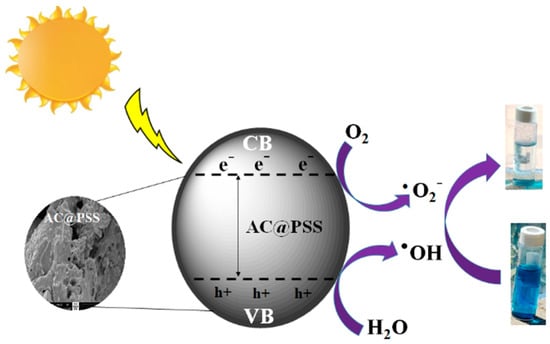 The photocatalytic mechanism of the degradation of MB dye using AC@PSS under UV-rich solar irradiation is shown in Figure 11. When photons that are irradiated from UV-rich solar irradiation with energy (4.0 EV) hit the surface of AC@PSS, electrons transition from the VB to the CB, which produces electron–hole pairs. The electrons are captured by dissolved oxygen, producing superoxide radicals (•O2−), which oxidize MB. Moreover, the holes (h+) at the VB of AC@PSS reacted with H2O, and •OH radicals were produced, which can oxidize MB to produce H2O and CO2. Therefore, the photo-degradation of MB is caused by the photo-produced radical •OH. Furthermore, the existence of adsorbed oxygen prevents the electrons from recombining with h+, enabling water molecules to interact with the free holes, thereby enhancing the efficiency of the photocatalytic process []. Moreover, the reactive oxygen species facilitate the oxidative degradation of MB into smaller intermediates and ultimately into CO2, water, and mineral byproducts as follows [,]: