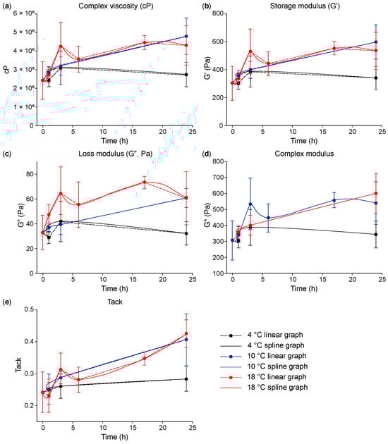 (a) Complex viscosity (cP), (b) storage modulus (G′), (c) loss modulus (G″), (d) complex modulus (G*), and (e) tack over dispersion time at each dispersion temperature (4 °C, 10 °C, and 18 °C, n = 3).