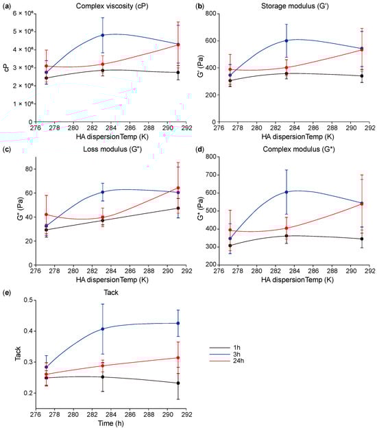 (a) Complex viscosity (cP), (b) storage modulus (G′), (c) loss modulus (G″), (d) complex modulus (G*), and (e) tack over dispersion temperature at each dispersion time (1 h, 3 h, and 24 h, n = 3).