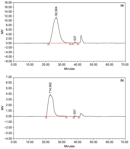 (a) GFC graph of 17 wt% HA in 0.25 N NaOH solution including the dispersion process (18 °C; 24 h); and (b) GFC graph of 17 wt% HA aqueous solution.