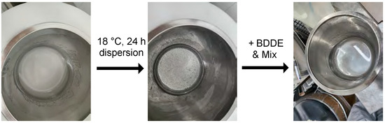 Based on the above results, the dispersion process at 18 °C for 24 h was introduced at the production scale (Batch B). When simply blending HA in the 0.25 N NaOH solution using a planetary mixer, the mixture was cloudy, and there were also areas where HA was clumped together in powder form.