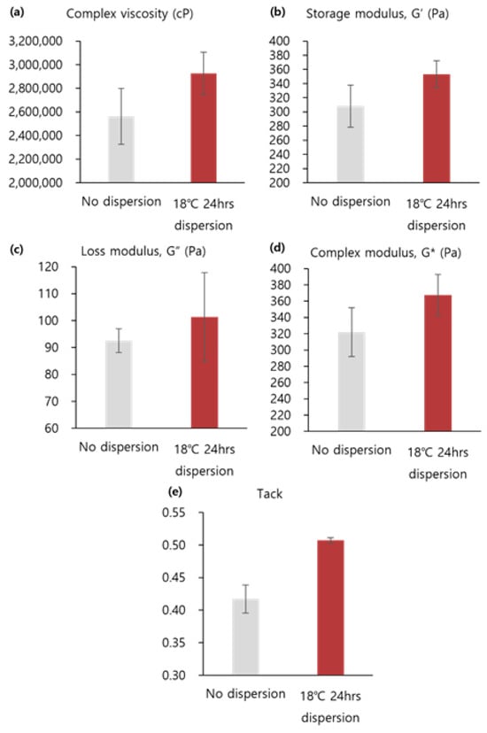 As shown in Figure 6a–c and Table S16, the complex viscosity and G′ of products manufactured in the dispersion process at 18 °C for 24 h were 1.2 times higher than those of products with no dispersion; G″ was 1.1 times higher. As shown in Figure 6d,e and Table S17, compared to the cohesion of the products, the tack and G* of products manufactured during the dispersion process at 18 °C for 24 h were 1.2 times higher than those of products with no dispersion. It can be concluded that the viscoelasticity and cohesion of products manufactured using the dispersion process were better than those of products with no dispersion.