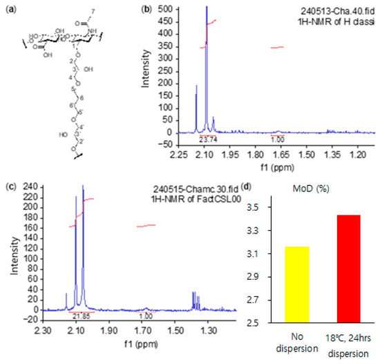 (a) The molecular structure of the BDDE-crosslinked HA dimer; (b) 1H NMR of the product being produced (no dispersion); (c) 1H NMR of the product made through a new process (18 °C and 24 h dispersion); and (d) graph detailing the MoD (%) of (b,c).