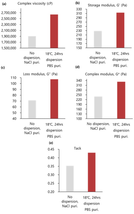 In Figure 2a–c and Tables S1–S9, complex viscosity, G′, and G″ show a tendency to increase over time, except at 4 °C. The graph of complex viscosity shows that the value for the previous experiment was roughly 2.4 McP, and the values for the experiment including the dispersion process were about 4.8 McP at 10 °C and 4.3 McP at 18 °C for 24 h—roughly twice the previous values.