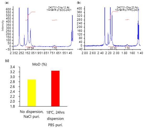 (a) Graph showing the 1H NMR of products made (with no dispersion) at the factory scale; (b) 1H NMR of the products made through the new process (18 °C and 24 h dispersion) at the factory scale; and (c) graph of the MoD (%) of (a,b).