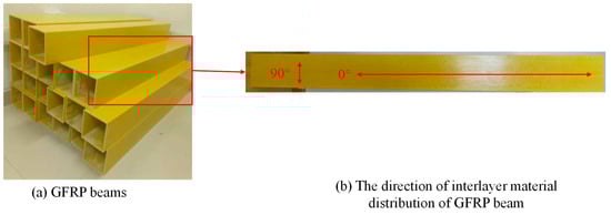 As outlined in Table 5, four types of GFRP square beams were designed, comprising the hollow GFRP beam (H-G beam), pure gypsum GFRP beam (G-G beam), reinforced gypsum GFRP beam (R-G beam), and PVA gypsum GFRP beam (P-G beam). Two identical test specimens were created for each type, resulting in a total of eight GFRP square beams that underwent four-point bending tests.