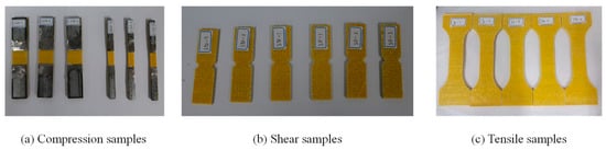 As shown in Figure 1a, the hollow pultruded GFRP square beams (length: 1.5 m, section area: 150 mm × 150 mm) used in this study were manufactured by Si Tong FRP Co., Ltd. (Soochow, China). In the pultrusion process, the material matrix is a thermosetting resin, and the fibers used are glass fibers. Through traction pultrusion and heating, the material is cured and formed into a single unit without differences in interlayer properties in the thickness direction. However, fibers are typically aligned along the axial direction of the profile. This fiber arrangement results in high strength and stiffness in the axial direction, allowing the profile to effectively withstand tensile, compressive, and bending mechanical stresses [35,36,37]. In this study, the GFRP material adopted this pultrusion process, which demonstrated the differences in mechanical properties in different directions. Therefore, the mechanical properties test was carried out in two directions of 0° and 90°, and the tensile, compression, and shear properties were tested, respectively. The direction is shown in Figure 1b. The direction of the extended square tube was set to 0°, and the direction perpendicular to 0° was 90°. The test samples are shown in Figure 2. The testing standards utilized were as follows: the in-plane shear performance testing standard was ASTM D5379-19; the in-plane tensile performance testing standard was ASTM D3039-07, and the in-plane compression performance testing standard was ASTM D3410-16 [38,39,40]. The three performance tests easily demonstrated the characteristics of orthotropic stratification, and the elastic modulus in the 0° direction was higher than that in the 90° direction, as shown in Table 1.