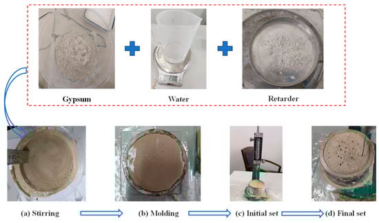 The initial and final setting times of pure gypsum are 5 min and 10 min, respectively; these times were insufficient for the pouring process. Therefore, a protein retarder (manufactured by Beijing Long Tengda Chemical Company) was introduced to extend the setting time, and coagulation tests were conducted to assess the retarder’s impact on the condensation time. The key steps of the main test, as illustrated in Figure 3, are as follows: