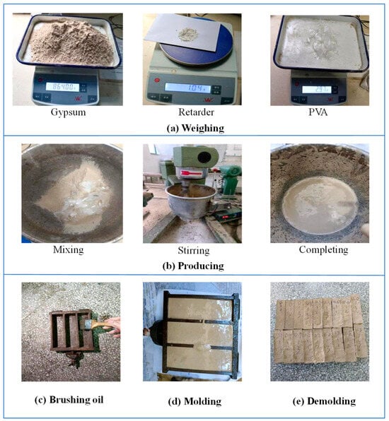 As depicted in Figure 4, PVA gypsum test blocks were fabricated in the laboratory, incorporating varying dosages (0~1.5%) of PVAs. The primary steps involved in this process are as follows: