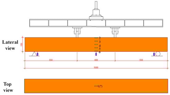 The four-point bending tests were conducted using the 50 T self-balancing device at Jiangsu University (ZF-F500). In preparation, seven strain gauges and three dial indicators were strategically installed, as shown in Figure 5. Among the seven strain gauges, five (No. 2~No. 6) are evenly distributed along the beam web, while two (No. 1 and No. 7) are positioned at the midpoint of the upper and lower panels. The three dial indicators were employed to record deflection, with two placed at the bottom ends and one situated at the bottom midpoint. The test standard is GB/T 1449 [43].