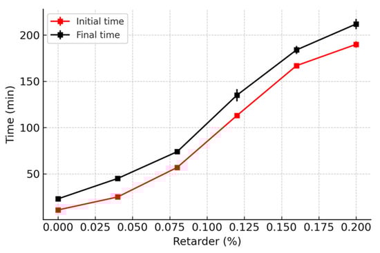 The relationship between the protein retarder dosage and the gypsum setting time is illustrated in Figure 6. The graph indicates that as the retarder dosage increases, both the initial and final setting times of gypsum extend. In the subsequent experiments, a protein retarder dosage of 0.12% is employed for gypsum or gypsum-based composites. The initial and final setting times are recorded as 113 min and 135 min, respectively, and these times are deemed suitable for specimen preparation.