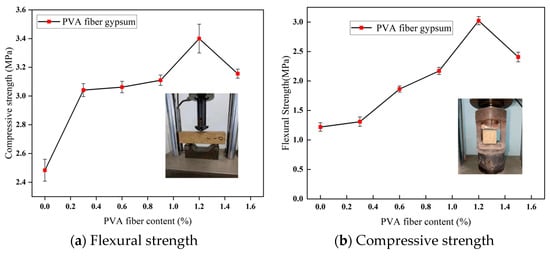 The test results are presented in Figure 7. As depicted in the figure, with the increase in PVA fiber content (0% to 1.2%), the flexural and compressive strength of PVA gypsum material increase, reaching maximum values of 2.97 MPa and 3.4 MPa, respectively, at a PVA dosage of 1.2%. However, the strength exhibits a downward trend when the dosage of PVA increases to 1.5%. Therefore, a PVA dosage of 1.2% is selected for the subsequent tests. When the PVA content increases from 0% to 1.2%, both flexural strength and compressive strength significantly improve. This is primarily due to the fiber’s crack-bridging effect, which enhances the material’s toughness and slows the propagation of microcracks, thus improving its load-bearing capacity. However, when the fiber content increases to 1.5%, the strength begins to decrease. This may be attributed to fiber agglomeration leading to uneven distribution and causing stress concentration. Moreover, an excess of fibers could disrupt the continuity of the gypsum matrix, reducing the effective bonding area of the matrix. Additionally, the bond strength at the fiber matrix interface may weaken, leading to increased interface debonding. These results suggest that the optimal fiber content is 1.2%; at this percentage, a balance between enhanced performance and material uniformity is achieved, maximizing the material’s overall properties.