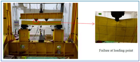 As illustrated in Figure 8, the hollow GFRP specimens undergo loading from two symmetric concentrated loads. As the loading level increases, the specimens generate a more pronounced sound, indicating deeper fiber fractures. Ultimately, all the specimens lose their strength due to the crushing failure of the GFRP panel at the loading points. Moreover, as shown in Figure 8, localized fiber damage leads to fracture failure, with a simultaneous loss of local load-bearing capacity, accompanied by noticeable buckling on the sides. This results in overall instability of the component. Therefore, to prevent buckling, the study introduced a series of filler materials, such as the gypsum matrix, to mitigate this issue.