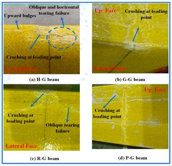 The hollow GFRP or GBIGC specimens exhibit different failure patterns around the loading points. In the case of the H-G beam shown in Figure 9a, the GFPR panel experiences intensive crushing at the loading points, especially at the junction between the upper flange and the web. This induces oblique and horizontal tearing failure, accompanied by an obvious upward bulge near the loading points. For the G-G beam in Figure 9b, it also displays intensive crushing at the loading points, but without oblique or horizontal tearing failure. This may be due to the good compatibility between the two materials in the G-G beam. The gypsum matrix provides supporting strength, which helps to avoid an excessive concentration of tensile stress to some extent. When the internal gypsum undergoes damage, it leads to localized crushing, while the tearing failure is mitigated. In the case of the R-G beam in Figure 9c, it not only shows intensive crushing at the loading points but also exhibits obvious oblique tearing failure below the crushing zone. When initial cracks occur locally, both the gypsum and the reinforcement can still function effectively. As the load increases, the gypsum gradually crushes and loses its effectiveness, but since the reinforcement remains intact, the material, primarily composed of GFRP, still has residual stress. The overall structure retains load-bearing capacity, which leads to further damage after GFRP failure. Compared to other structures, localized fractures in this case are more pronounced. However, for the P-G beam in Figure 9d, it displays relatively light local compression failure at the loading points, indicating better local compressive mechanical performance. Compared to ordinary gypsum, PVA-reinforced gypsum exhibits a significant improvement in both compressive and flexural strength. Additionally, the gypsum matrix shows good compatibility with GFRP, which effectively enhances the stiffness and strength at the loading points, reducing the occurrence of concentrated stress.