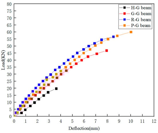 The load–deflection curves of the GFRP square beams are presented in Figure 10. The curves illustrate that the gradient of the curve, which represents rigidity, for G-G beam, R-G beam, and P-G beam is greater than that of H-G beam. R-G beam exhibits the greatest stiffness, followed by P-G beam and G-G beam. The ultimate load values of the infilled beams are significantly improved compared to that of H-G beam. It was also found that the stiffness of the R-G beam is the highest, but its ultimate strength is 7% lower than that of the P-G beam. This is because the strength of the reinforcement itself is higher than that of the PVAs, which results in higher stiffness at the initial stage of the experiment. However, as the load increases, the bond between the gypsum and reinforcement in the R-G beam is not optimal, leading to a failure similar to over-reinforcement, where the bending resistance of the materials prevents them from working together effectively. In contrast, the fibers and gypsum in the P-G beam show good compatibility, with the fibers having strong ductility. This results in higher load-bearing capacity and greater displacement at the monitoring points, making the P-G beam more suitable for practical weight-reduction applications.