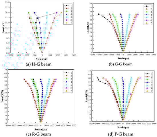 The load–strain curves of the four types of specimens are drawn in Figure 11. The strain values of No.1~No.3 gauges are negative values, as they are installed in the compression zone, and the strain values of No.5~No.7 gauges are positive values because they are installed in the tensile zone. The strain value of No.4 gauge is near zero, as it is located at a neutral axis. Generally, the absolute strain values at all gauges of G-G, R-G and P-G beams increase with the loading level, which demonstrates the linear load–strain relationship.