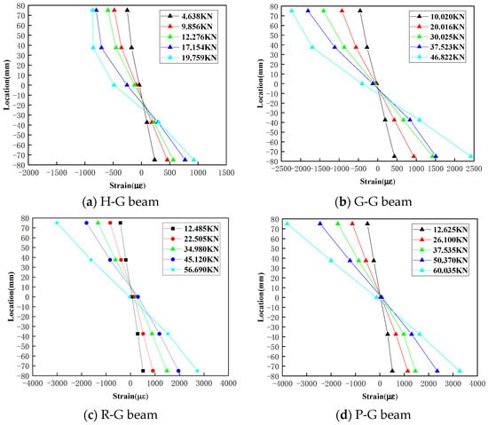 Based on the strain data from gauges (No.2~No.5) installed on the webs of the specimens, strain distribution curves along the height can be derived, as depicted in Figure 12. Generally, the strain along the web height conforms to a linear distribution rule, aligning with the plane section assumption of beam deformation in material mechanics [40]. In Figure 12a, it can be observed that the curves at 4.638 kN and 9.856 kN are linear, indicating that the material is still in the elastic phase. As the applied load increases, the curves at 12.276 kN, 17.154 kN, and 19.759 kN exhibit nonlinear characteristics, with some regions entering the plastic phase. At higher load levels, strain changes rapidly at the top, indicating that yielding has occurred.