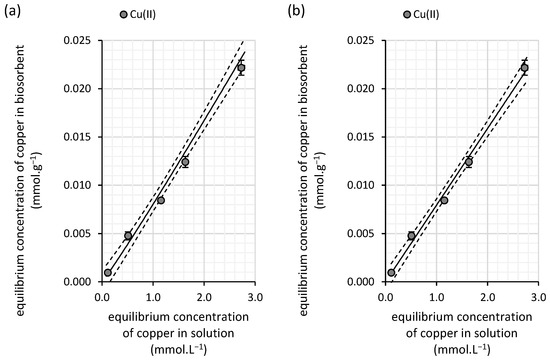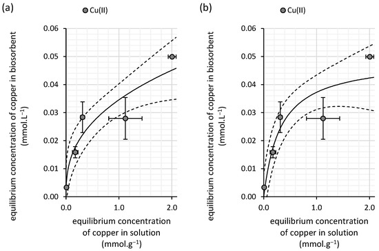 Isotherm fits of the experimental data for copper(II) removal from aqueous solutions by milk kefir grains using the (a) Freundlich and (b) Langmuir isotherm models (solid lines). The experiments were conducted in darkness at 25 °C under dynamic conditions (45 rpm) with initial copper(II) concentrations ranging from 0.16 to 4.2 mmol∙L−1 (initial pH of 6.0; contact time of 100 h; n = 3). The dashed line represents the 95% confidence interval for each isotherm model.
