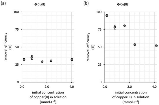 Removal efficiencies for copper(II) from aqueous solutions using (a) water and (b) milk kefir grains (n = 3; temperature of 25 °C; dynamic conditions (45 rpm); initial copper(II) concentrations ranging from 0.16 to 4.2 mmol∙L−1; initial pH of 6.0; contact time of 100 h).