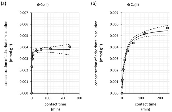 Kinetics of the copper(II) removal from aqueous solutions by (a) water kefir and (b) milk kefir grains fitted using pseudo-second-order kinetic model (solid line). The experiments were conducted in darkness at 25 °C under dynamic conditions (45 rpm) with initial copper(II) concentration of 0.79 mmol∙L−1 (50 mg∙L−1; initial pH of 6.0; n = 2). The dashed line represents the 95% confidence interval for the applied kinetic model.