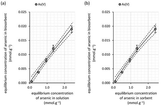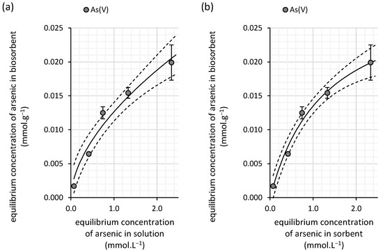 Fits of the experimental data for arsenic(V) removal from aqueous solutions by milk kefir grains using the (a) Freundlich and (b) Langmuir isotherm models (solid lines). The experiments were conducted in darkness at 25 °C under dynamic conditions (45 rpm) with initial arsenic(V) concentrations ranging from 0.16 to 3.4 mmol∙L−1 (initial pH of 6.0; contact time of 100 h; n = 3). The dashed line represents the 95% confidence interval for each isotherm model.