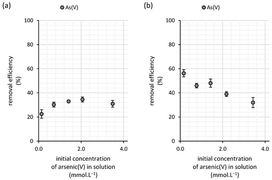 Removal efficiencies for arsenic(V) from aqueous solutions using (a) water and (b) milk kefir grains (n = 3; temperature of 25 °C; dynamic conditions (45 rpm); initial arsenic(V) concentrations ranging from 0.14 to 3.5 mmol∙L−1; initial pH of 6.0; contact time of 100 h).