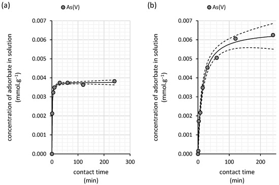 Kinetics of the arsenic(V) removal from aqueous solutions by (a) water kefir and (b) milk kefir grains fitted using pseudo-second-order kinetic model (solid line). The experiments were conducted in darkness at 25 °C under dynamic conditions (45 rpm) with initial arsenic(V) concentration of 0.67 mmol∙L−1 (50 mg∙L−1; initial pH of 6.0; n = 2). The dashed line represents the 95% confidence interval for the applied kinetic model.