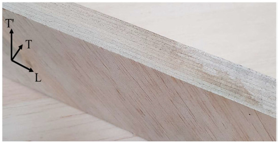 The two laminar configurations, B(±45) and B(±45/90), have been obtained by laminating thin balsa sheets, about 2 mm thick, with a vertical lamination plane. The sheets were carefully bonded together with the same green epoxy resin used for the skins as described above. The proposed laminated core B(±45/90), so obtained, is shown in the following Figure 2.