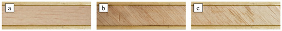 Using the skins and the three core types [B(0), B(±45), and B(±45/90)] described in the previous chapters, three types of sandwiches have been obtained by simply gluing the skins and core together, still using the green epoxy resin used as the matrix of the skins. In the first type of sandwich, called SB(0), the core consists of a simple balsa panel with longitudinal fibers (see Figure 3a); in the second type, called SB(±45), the core consists of a cross-ply balsa laminate with lay-up [±45°] (see Figure 3b); in the third type, called SB(±45/90), the core consists of an angle-ply balsa laminate with lay-up [±45/90] (Figure 3c).
