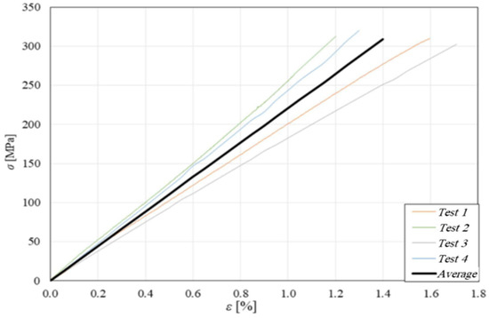 The mechanical behavior of the skins has been determined through tensile tests performed in accordance with ASTM standard D3039 [25], monitoring the strains with a knife extensometer having a 25 mm measuring base. The following Figure 4 shows the result of the tensile tests performed on 4 separate specimens, together with the corresponding average curve. The observation of these curves shows a linear elastic behavior of the skins until fracture, which occurs with an ultimate tensile stress = 310 MPa, a failure strain of about 1.4%, and a longitudinal modulus of Es = 22 GPa.