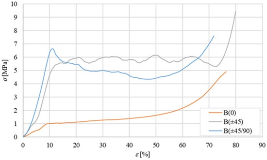 Considering that, due to the relatively high shear stiffness of the skin with respect to the core, the shear characterization of the core results in practice in the simple shear characterization of the sandwich, the characterization of the simple core has been carried out by considering only the so-called flatwise (‘transversal’) compression test, leaving the shear characterization of the core to the following shear characterization of the sandwich according to the ASTM C365-57 [26]. The average flatwise compression curves obtained for the three core configurations B(0), B(±45), and B(±45/90) are shown in Figure 5 below: