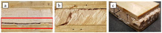 In order to confirm the shear failure modes, images of the three different sandwiches after the shear tests are shown in Figure 8 below: