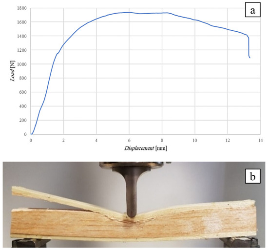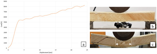 The following Figure 10 shows the flexural curve (vertical displacement measured by means of a special LVDT-type displacement transducer) of the SB(0)10 sandwich, i.e., the sandwich with a 10 mm thick simple balsa core, together with the image of the specimen during the test (Figure 10b) and after failure (Figure 10c). In order to limit the indentation phenomena, a punch consisting of a large cylinder with a diameter of 80 mm was used (see Figure 10b).