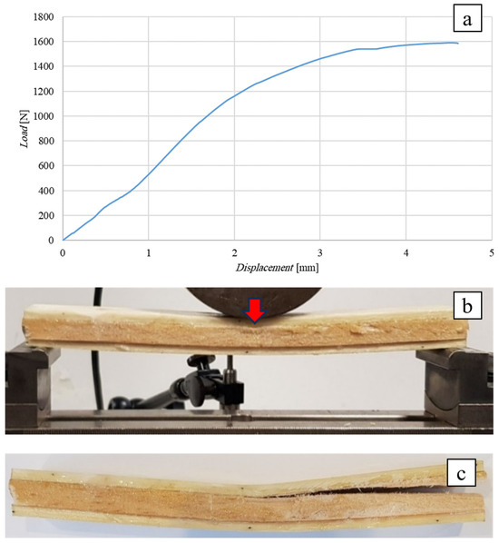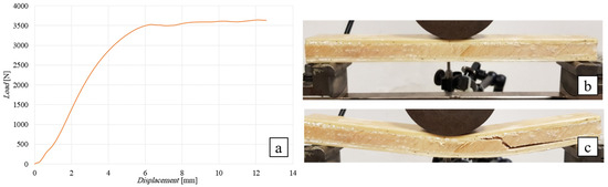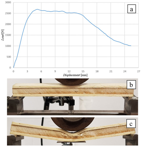 Flexural test of the SB(0)10 sandwich: (a) flexural curve, (b) specimen during, and (c) after the test.
