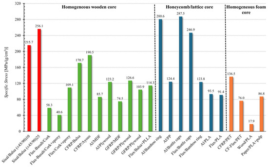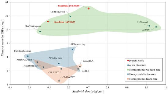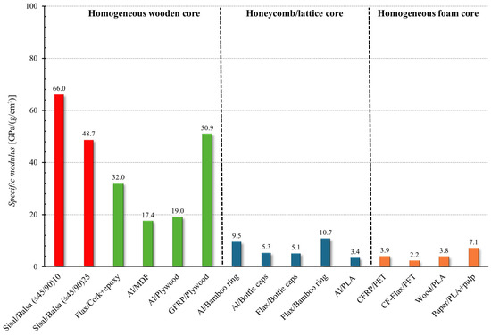 - in terms of absolute and specific flexural modulus, instead, the performance of the proposed sandwich is significantly higher than that of the honeycomb/lattice core and foam core and comparable with the sandwich having a homogeneous wooden core.