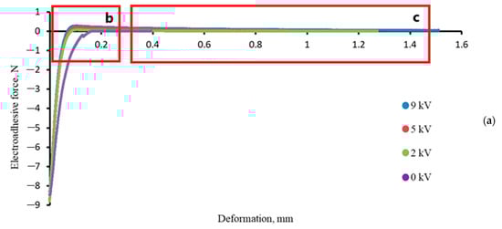 Figure 8 shows adhesion profiles obtained using Method 1 in force-deformation coordinates. It is evident that as the mechanical stress specified by the preload is removed, electroadhesive forces are realized in the system. The electroadhesive substrate system, in which electroadhesive interactions were not excited after the application of preload, was used as a zero comparison object. The difference in the forces expended on the destruction of systems with and without the application of electrical voltage was established.