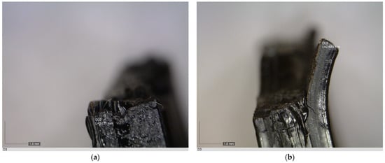 The obtained values, more precisely the maximum and minimum length, as well as average and median length, indicate that on average, jagged pieces were not longer than 1 mm, while the maximum measured length was not longer than 3 mm. Photomicrographs of some of the fragments are shown in Figure 7.