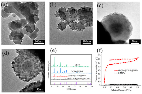 TEM images of (a) ZIF-8, (b) G-QD@ZIF-8, (c) G-QD@ZIF-8@MIP, and (d) G-QD@ZIF-8@MIP@R-QD microspheres. (e) XRD patterns of obtained polymers. (f) Adsorption–desorption isotherms for G-QD@ZIF-8@MIP and S-MIP microspheres.