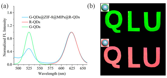 In this study, G-QDs (λem = 525 nm) and R-QDs (λem = 625 nm) were selected as the fluorescent elements of the dual-emission fluorescent system. As shown in Figure 2a, the fabricated G-QD@ZIF-8@MIP@R-QD fluorescent system exhibited well-resolved individual emission peaks. Compared with the original pure G-QDs and R-QDs, the photoluminescence peak position was slightly blue-shifted at 625 nm within 2 nm owing to the accumulation of a few R-QDs.