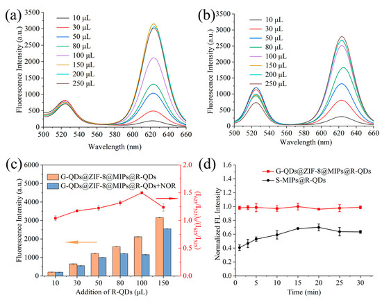 The R-QD content was a key factor during the process of fluorescent encoding, mainly influencing the fluorescent intensity and sensitivity of the fluorescent encoded microspheres. At a low QD content, the fluorescent intensity of the encoded microspheres could be limited and not meet the requirement of detection, while too many QDs would induce excessive fluorescent intensity and reduce the sensitivity of the detection method [27]. The relationship between different R-QD contents (10, 30, 50, 80, 100, 150, 200, and 250 µL) and the fluorescent intensity of G-QD@ZIF-8@MIP@R-QD and G-QD@ZIF-8@NIP@R-QD microspheres at 625 nm was investigated. As shown in Figure 3a,b, a progressive enhancement in the fluorescent intensity was observed with the increasing concentration of R-QDs in the range of 10–150 μL, while the fluorescent intensity of G-QDs at 525 nm remained almost constant. This indicated that the G-QDs and R-QDs were located within the ZIF-8 and the molecularly imprinted layer, respectively, which enabled the efficient separation of G-QDs and R-QDs and prevented the effect of direct contact on their fluorescent properties. Meanwhile, it was also found that G-QD@ZIF-8@MIP@R-QD microspheres produced a much greater fluorescent intensity than that of the non-imprinted microspheres when the R-QD content was greater than 100 μL because amounts of R-QDs could be trapped in the imprinted cavities of the imprinted polymers to exhibit stronger fluorescent performance.
