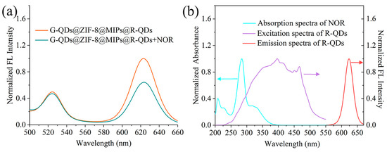 (a) Fluorescent spectra of G-QD@ZIF-8@MIP@R-QD microspheres before and after the addition of NOR. (b) UV–visible absorption spectra of NOR and fluorescent excitation and emission spectra of R-QDs.