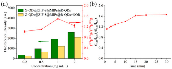(a) Effect of encoded microsphere addition on the fluorescent detection system. (b) Time response of G-QD@ZIF-8@MIP@R-QDs for NOR detection.