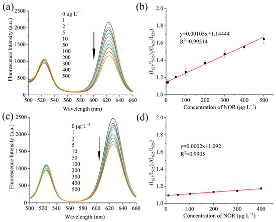 With the optimization of detection conditions, a ratiometric fluorescent sensor with G-QD@ZIF-8@MIP@R-QD microspheres as the fluorescent matrix was established. Upon the addition of NOR concentrations ranging from 0 to 500 μg L−1, the fluorescent response changes of G-QD@ZIF-8@MIP@R-QDs and G-QD@ZIF-8@NIP@R-QDs were recorded, as shown in Figure 7a,c. When the NOR concentration was increased, the fluorescent intensity at 525 nm was almost constant, while the red intensity at 625 nm underwent a gradual decrease. Based on previous reports, the relationship between fluorescent intensity and concentration could be analyzed using the following Stern–Volmer equation [32]: