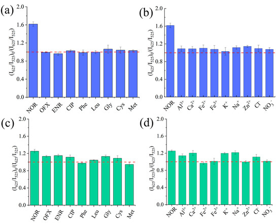 In the control experiments, structural analogues (OFX, ENR, and CIP), amino acids (Phe, Leu, Gly, Cys, and Met), and ions (Al3+, Ca2+, Fe2+, Fe3+, K+, Na+, Zn2+, Cl−, and NO3−) commonly found in foods were separately added into the G-QD@ZIF-8@MIP@R-QD and G-QD@ZIF-8@NIP@R-QD fluorescent systems, and the fluorescent intensity changes ((I625/I525)0/(I625/I525)) were recorded. The mass concentrations of these interfering compounds and NOR were 10 mg L−1 and 500 µg L−1.