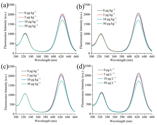 Fluorescent spectra of G-QD@ZIF-8@MIP@R-QD sensor for (a) chicken, (b) pork, (c) fish, and (d) milk samples with spiked concentrations of 0, 5, 10, and 50 μg kg−1/μg L−1.