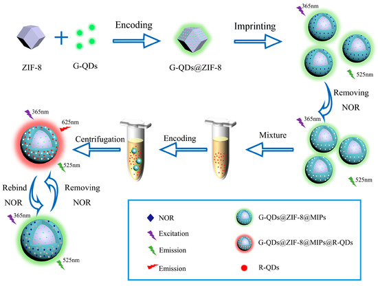Based on the above considerations, the aim of this research was to introduce a novel approach for the preparation of dual-emission fluorescent molecularly imprinted sensors and to apply them for rapid, accurate, and sensitive detection of NOR in food samples. The characterization of the encoded microspheres, their fluorescent performance, encoding conditions, detection conditions, and practical applications were all evaluated in detail.